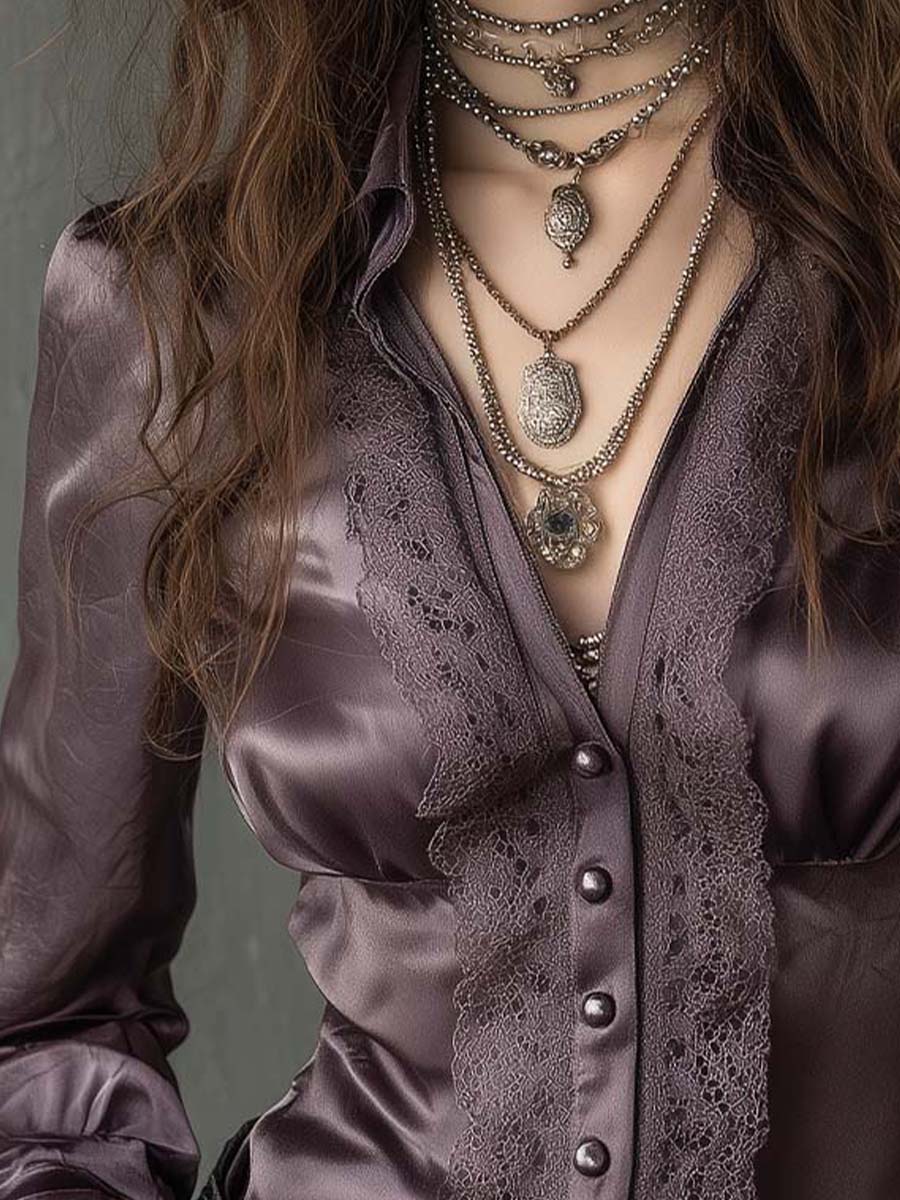 This refined lace-trim blouse is crafted in a smooth, satin-look fabric with a soft natural sheen, designed to flatter the silhouette without feeling restrictive. The color is Dusty Plum, a key Spring–Summer 2026 trend tone, sitting between muted mauve and cool taupe—elegant, wearable, and highly versatile for modern wardrobes.