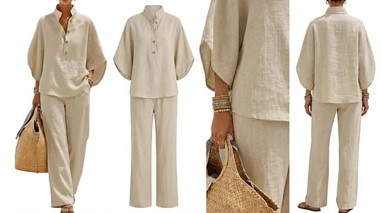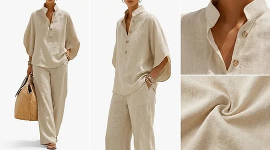 This breathable cotton-linen two-piece set features a relaxed button blouse and wide-leg pants, creating a clean, minimal, and timeless look perfect for any occasion.