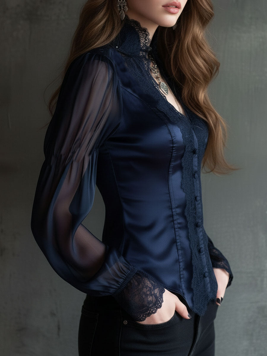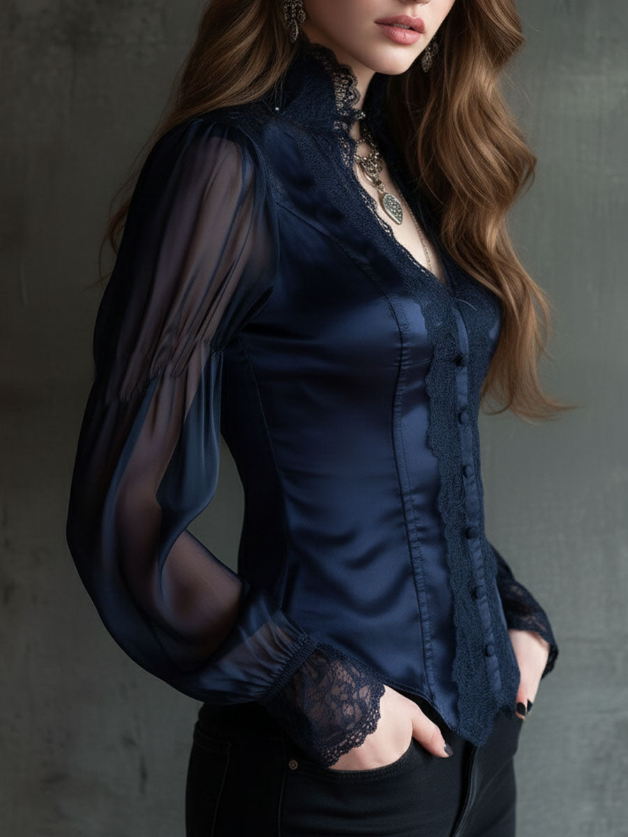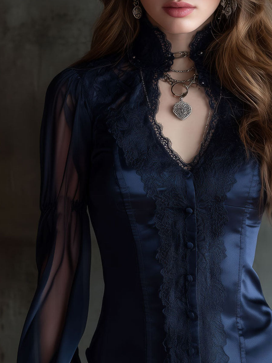 This exquisite Vintage Victorian Navy Satin and Lace Blouse captures the elegance of a bygone era. The blouse features luxurious satin fabric in a deep navy hue, complemented by intricate lace detailing and sheer sleeves that add a touch of romantic sophistication. The high neckline and buttoned cuffs further enhance its vintage charm.